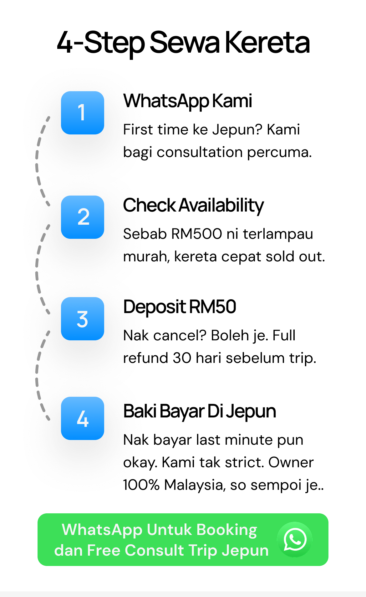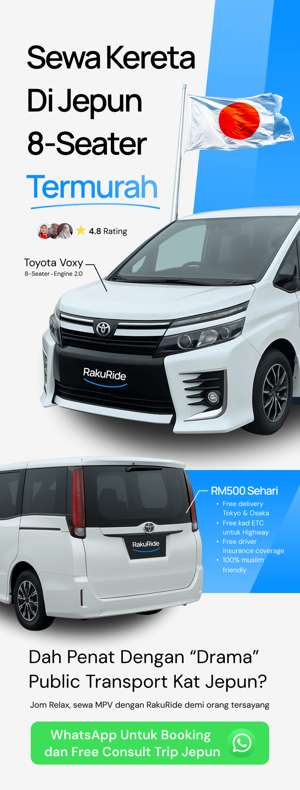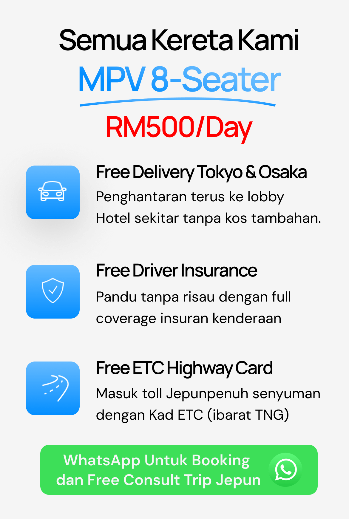 Relax lah, tak susah pun! Pemanduan kat Jepun ni sama macam Malaysia, sebelah kiri jalan. Jalan dia pun memang tiptop, tersusun rapi, dengan signboard yang senang sangat nak faham. Anda akan dapat ETC card percuma untuk tol, jadi takde lah stress nak bayar tunai. Nanti kami share tips pemanduan asas kat Jepun sekali!
