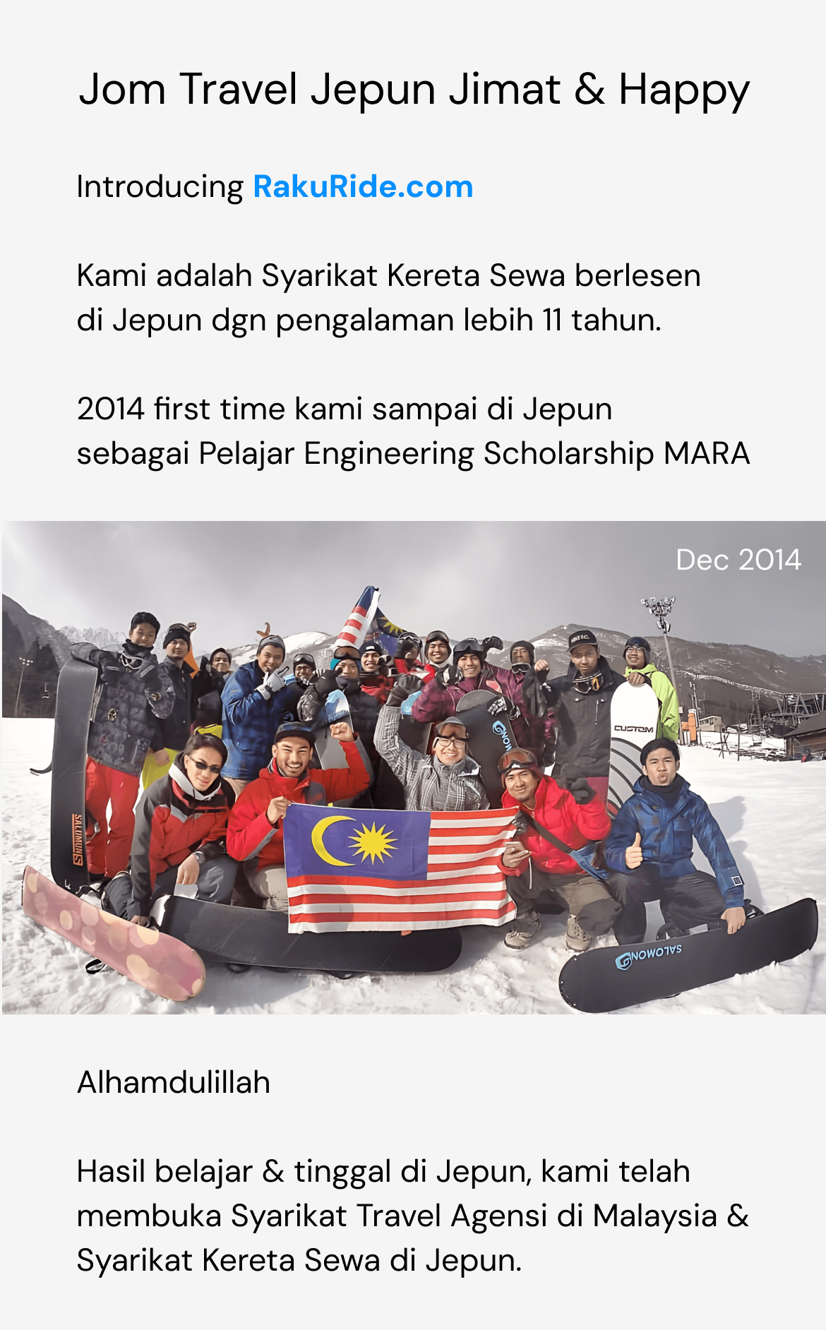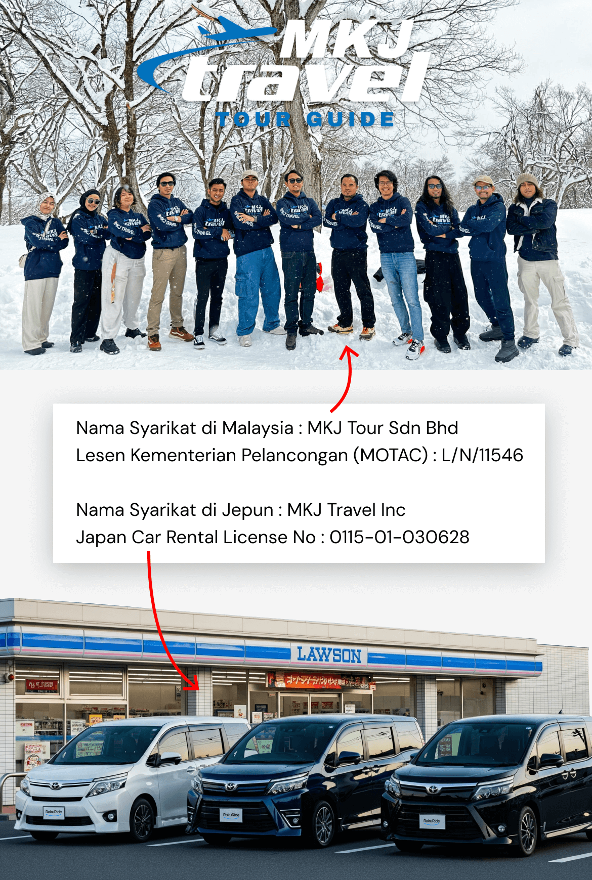 Kami faham sangat kalau anda risau. RakuRide ni sebenarnya anak syarikat MKJ Travel Inc. (owner melancongkejepun.com), syarikat travel yang dah beroperasi dan berdaftar secara sah kat Jepun sejak April 2024. Anda boleh check nombor pendaftaran syarikat kami di Jepun iaitu 0115-01-030628 untuk kepastian. Kami memang committed nak bagi servis yang transparent dan terbaik untuk semua pelanggan kami!