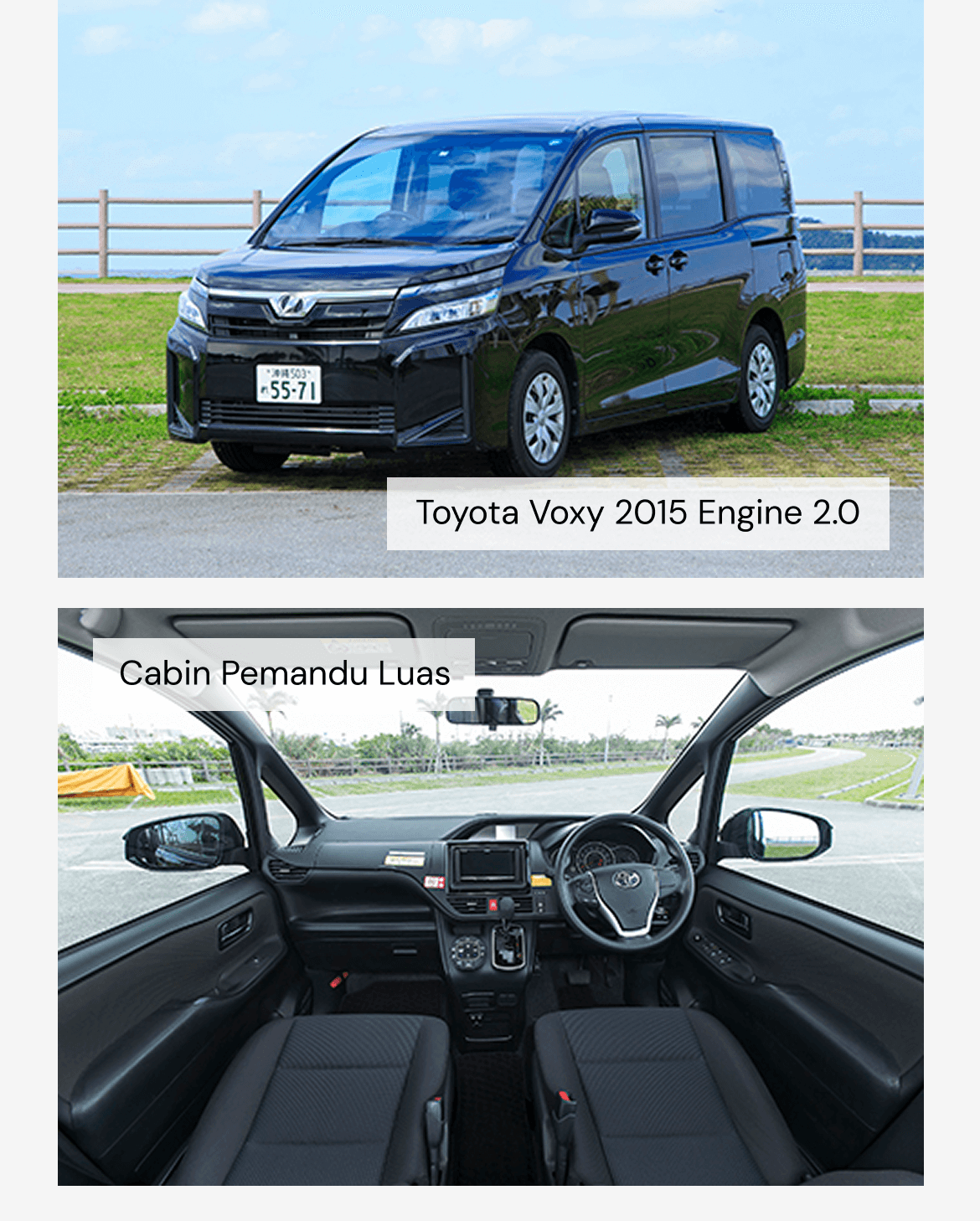 Semua kereta kami adalah satu jenis kereta je, Toyota Voxy 8 Seater Engine 2.0 keluaran tahun 2015 yang memang masih maintain baru dan selesa! Harga pun memang confirm tak cekik darah, RM500 je sewa sehari.